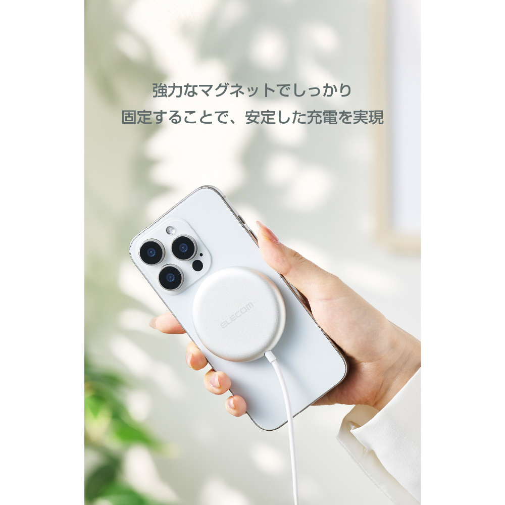 マグネットでスマートフォンの背面にぴったりくっつくため、スマホ操作をしながらの充電も快適です。