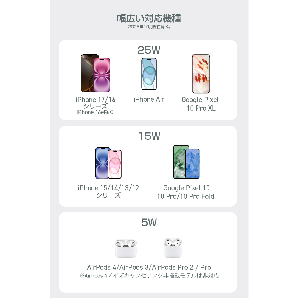 ※本製品にはUSB出力アダプター(AC充電器など)は付属しておりません。25Wでのワイヤレス充電には、USB Power Delivery 45W以上、15Wでのワイヤレス充電にはUSB Power Delivery 30W以上に対応したUSB出力アダプターを別途ご用意ください。