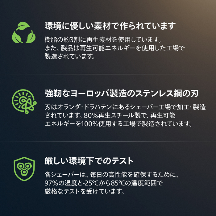 ヘッドに施されたマイクロビーズコーティングが肌の負担を低減。1平方センチメートルあたり最大50万個のマイクロビーズで、非コーティングの場合と比較した際に肌との摩擦を50%少なく、やさしくシェービング。