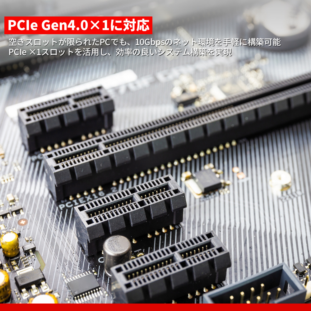 PCI Express Gen3.0の2倍の帯域を持つPCI Express Gen4.0の搭載により、×1レーンでも最大10Gbpsの通信を安定して処理できます。