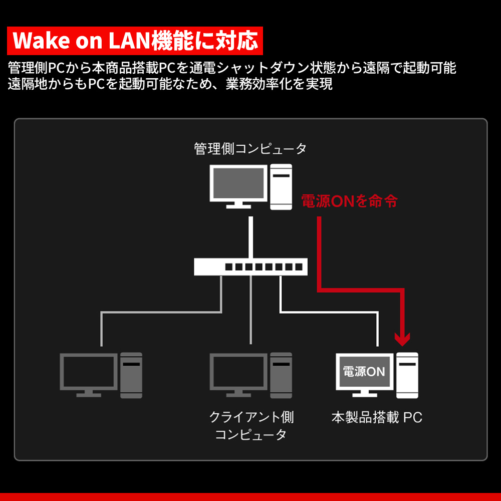 本製品はハードウェアによるWake on LAN (WoL)機能に対応しています。本製品宛てに、マジック・パケットを送信することで、取り付けたパソコンを通電シャットダウン状態から起動させることができます。リモートワークなど、遠隔のパソコンを利用しなければならない場合に、電源オフのパソコンでも電源ボタンを押さずにパソコンを起動できるようになるため、便利です。