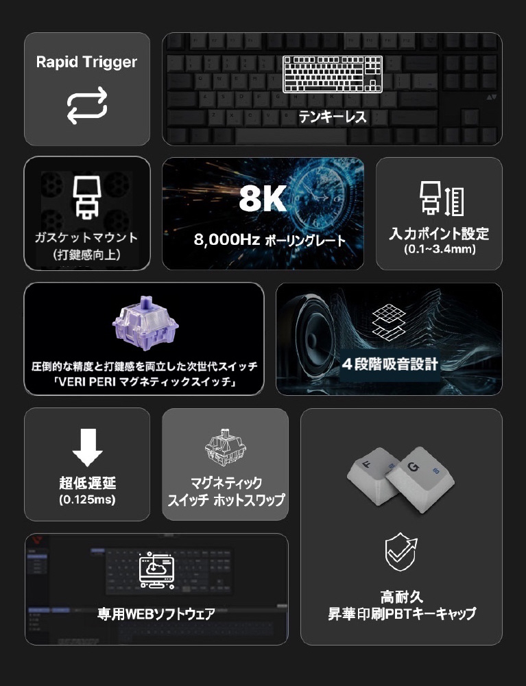 8kHzポーリングレート、入力遅延0.125msのハイパフォーマンスに対応。また、打鍵感を向上させるためにガスケットマウント方式を採用しています。圧倒的な精度と打鍵感を両立した次世代スイッチ「VERY PERIマグネティックスイッチ」を採用し、反発力に優れたスプリングによる軽快な打鍵感が特長です。