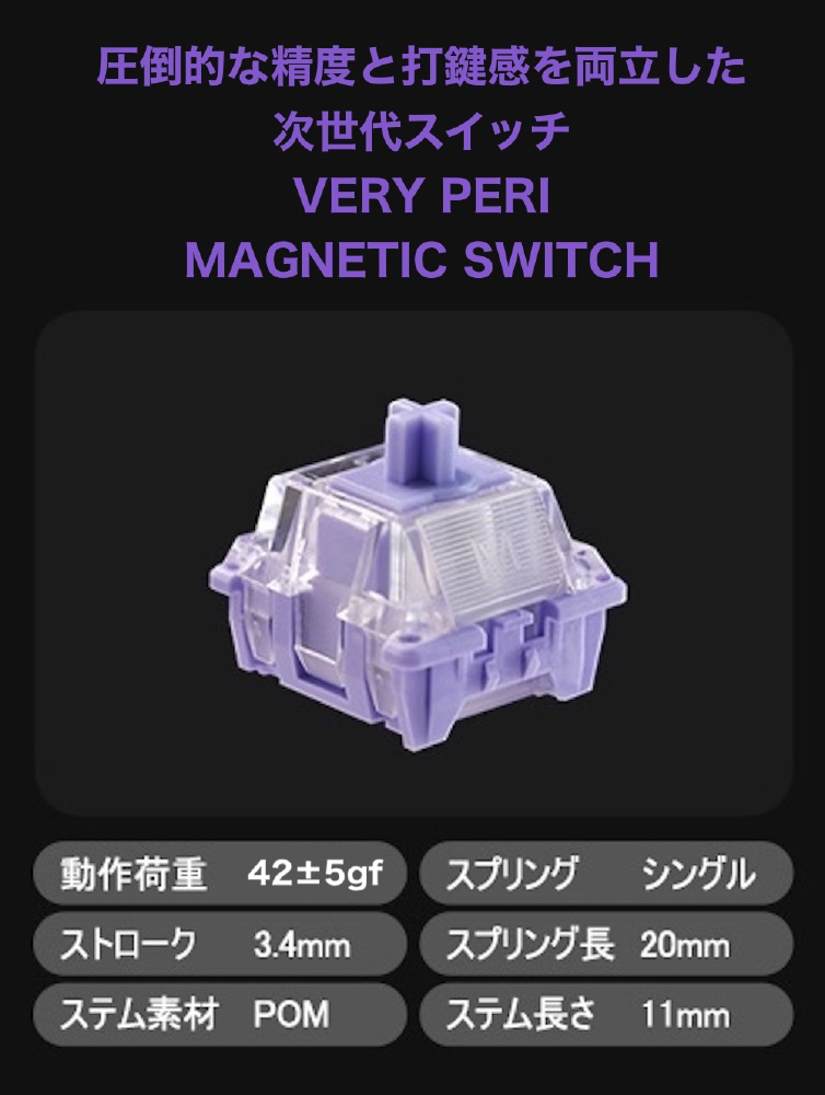 スイッチメーカーであるVAROにより開発された「VERY PERI マグネティックスイッチ」を採用。高精度センサーによる高速なレスポンスと軸ブレを抑えたぐらつきのない安定したキー入力を可能にします。また、反発力に優れたスプリングと精密な潤滑処理で滑らかで軽快な打鍵感を提供します。