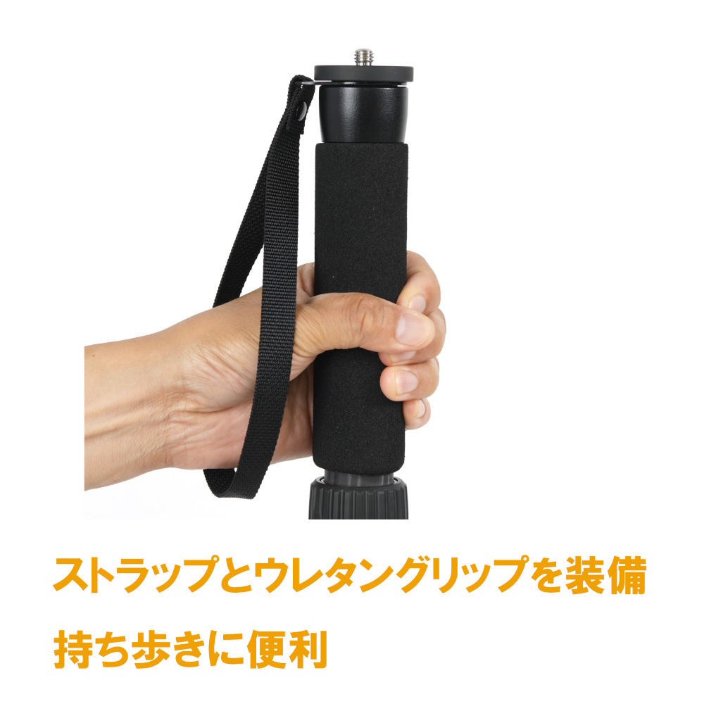 ストラップは、持ち運び時には手を通して落下防止に。撮影時は手を通すことで一脚の転倒防止に役立ちます。持ち運びの際、手が冷たくなりにくいウレタングリップ付。
