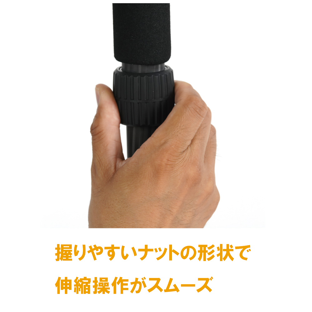 握りやすい大型ゴムローレットナットにより、力をかけやすく伸縮がスムーズに行えます。しっかり固定できる、プロ仕様です。