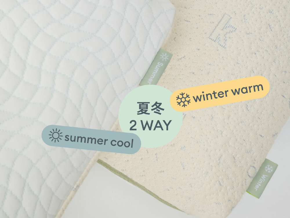 取り外して洗えるカバーは、冬用と夏用のリバーシブルデザイン。冬向けは優しい肌触りのオーガニックコットン、夏向けにはひんやりCOOLTHREAD(TM)素材を採用。