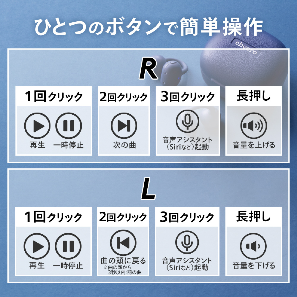 操作ボタンに意図せず触れてしまっても誤操作が起きないよう、タッチセンサー式ではなく物理ボタンを採用。音楽や通話をストレスなく楽しめます。