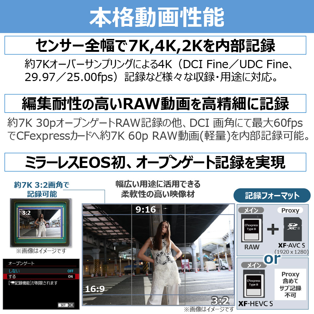 オーバーサンプリングによる4K動画記録やセンサーの横幅をクロップせずに記録できるフル水平画角での4K120Pハイフレームレート記録に対応しています。さらに、センサー全体※を利用することで通常のモードより広い画角である3:2のアスペクト比で記録が可能な7Kオープンゲート記録機能を搭載するなど、用途に応じた動画撮影機能により、多様化する動画制作のニーズに応えます。