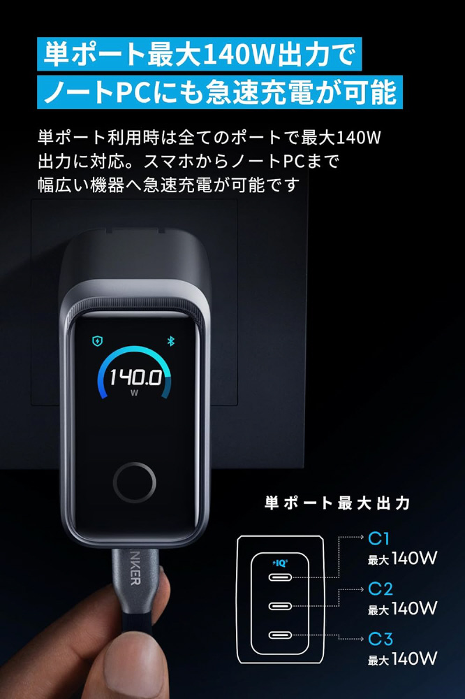 単ポート利用時は全てのポートで最大140W出力に対応。スマホからノートPCまで幅広い機器へ急速充電が可能です。
