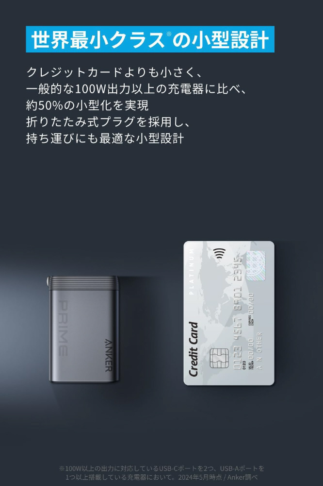 クレジットカードよりも小さく、一般的な100W出力以上の充電器に比べ、約50%の小型化を実現。折りたたみ式プラグを採用し、持ち運びにも最適な小型設計
