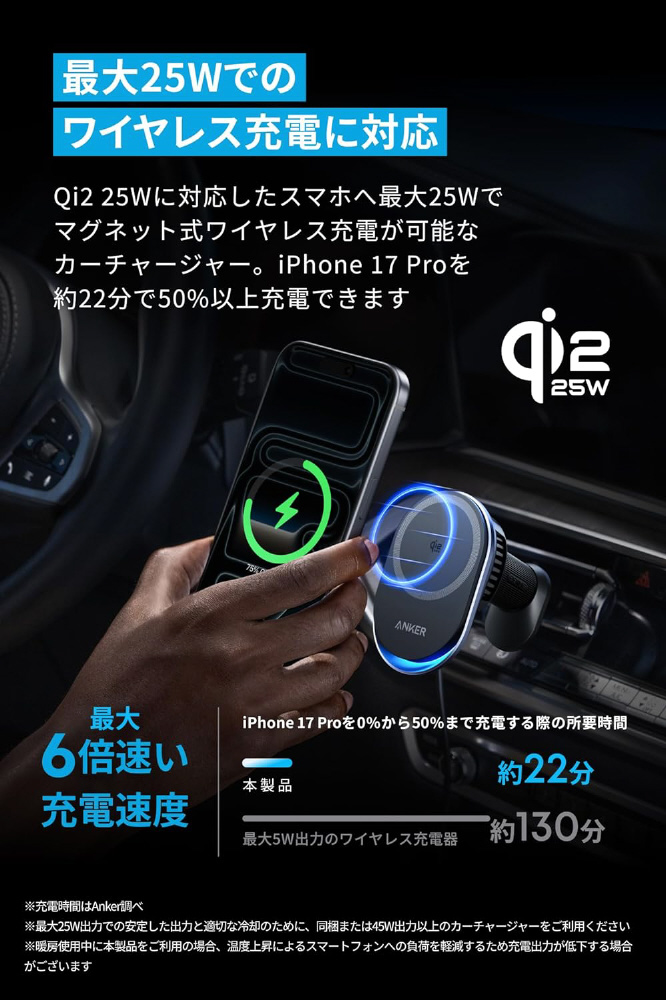 Qi2 25Wに対応したスマホへ最大25Wでマグネット式ワイヤレス充電が可能なカーチャージャー。iPhone 17 Proを約22分で50%以上充電できます。