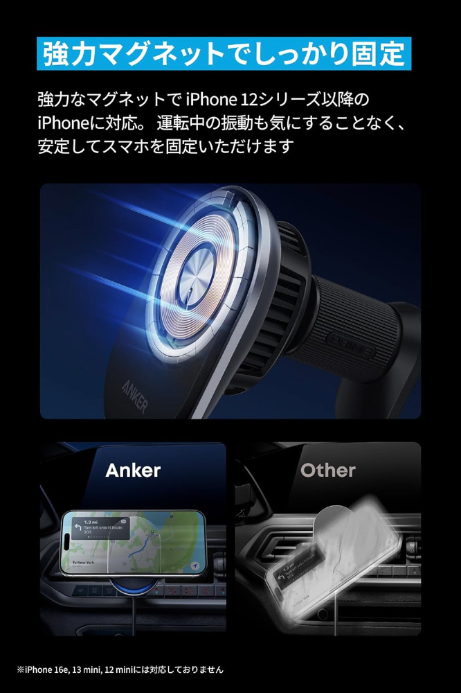強力なマグネットで iPhone 12シリーズ以降のiPhoneに対応。 運転中の振動も気にすることなく、 安定してスマホを固定いただけます。