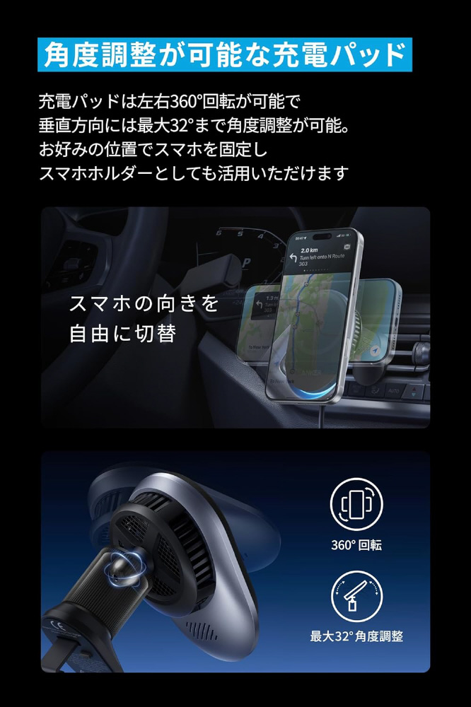 充電パッドは左右360°回転が可能で垂直方向には最大32°まで角度調整が可能。お好みの位置でスマホを固定しスマホホルダーとしても活用いただけます。