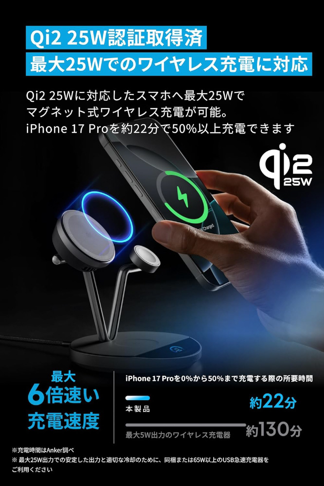 Qi2 25Wに対応したスマホへ最大25Wでマグネット式ワイヤレス充電が可能。 iPhone 17 Proを約22分で50%以上充電できます。
