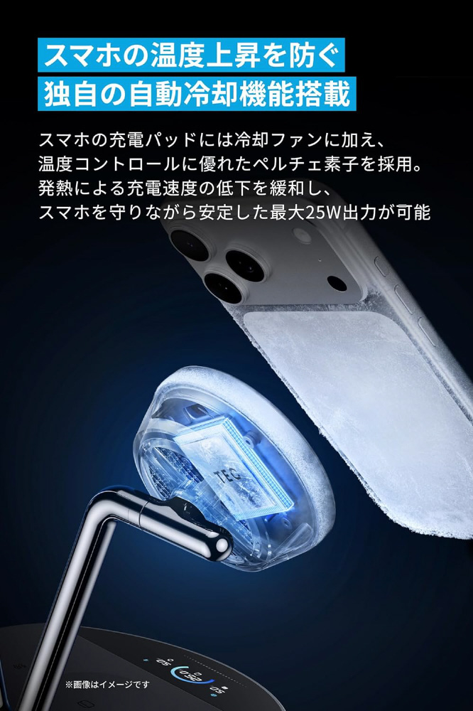 スマホの充電パッドには冷却ファンに加え、温度コントロールに優れたペルチェ素子を採用。発熱による充電速度の低下を緩和し、スマホを守りながら安定した最大25W出力が可能。