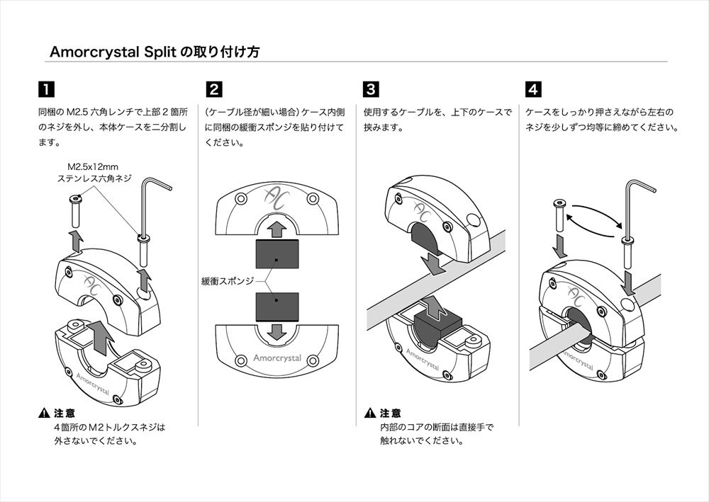「Amorcrystal Split(for デジタル)」はケーブル直径14mm以内であれば誰でも容易に取り付けることができ、本機はデジタル機器用として開発されております。