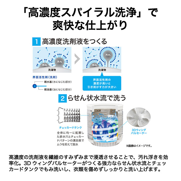 高濃度の洗剤液を繊維のすみずみまで浸透させることで。汚れ浮きを効率化。3Dウィングパルセーターがつくる強力ならせん状水流とチェッカードタンクでもみ洗いし、衣類を痛めずしっかりと洗い上げます。