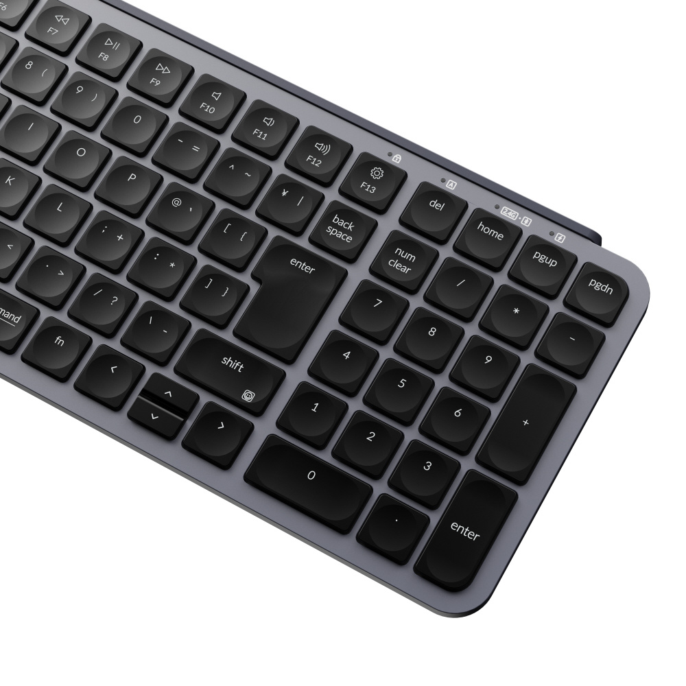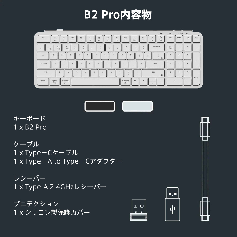 Keychron B2 Pro は、96%レイアウトを採用した超薄型・軽量ワイヤレスキーボードです。 2.4GHzワイヤレス、Bluetooth、有線接続に対応し、スマートフォン・タブレット・PC・Macなど、さまざまなデバイスへシームレスに接続可能。
