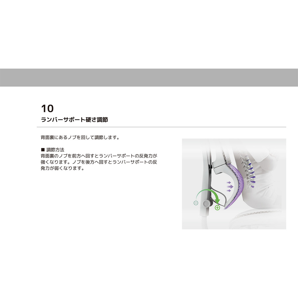 エルゴヒューマンの最大の特徴である”独立式ランバーサポート” 背面との一体型が主流だったランバーサポートを背面から独立させ、腰を独自にサポートするように設計しています。新シリーズではランバーサポート部の角度とテンションは背面から独立して個別に調節できるようになりました。
