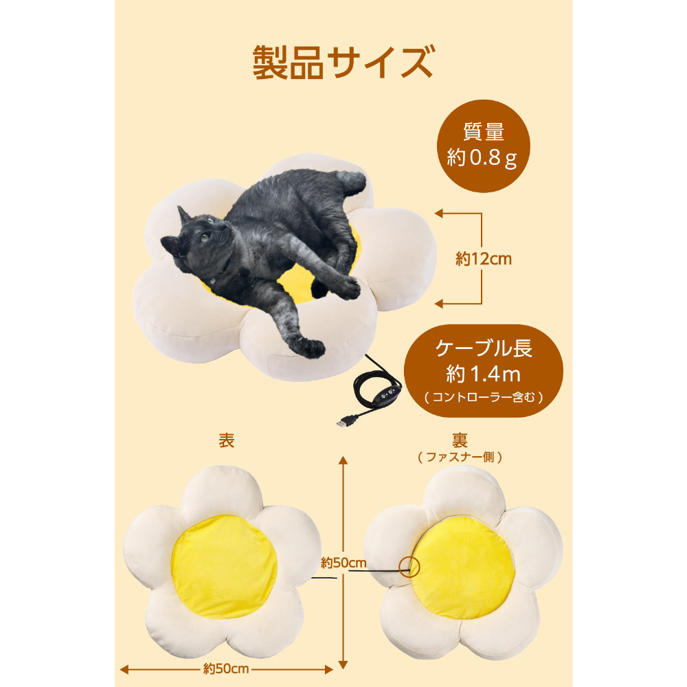 ペットヒーター クッション 犬 猫 ベッド・室内・持ち運びOK 花びら型 USB給電 モバイルバッテリー対応 2段階温度(約32/39℃) タイマー3/6h 撥水 洗濯可能 噛み対策メッシュケーブル クッションφ50cm ベージュ