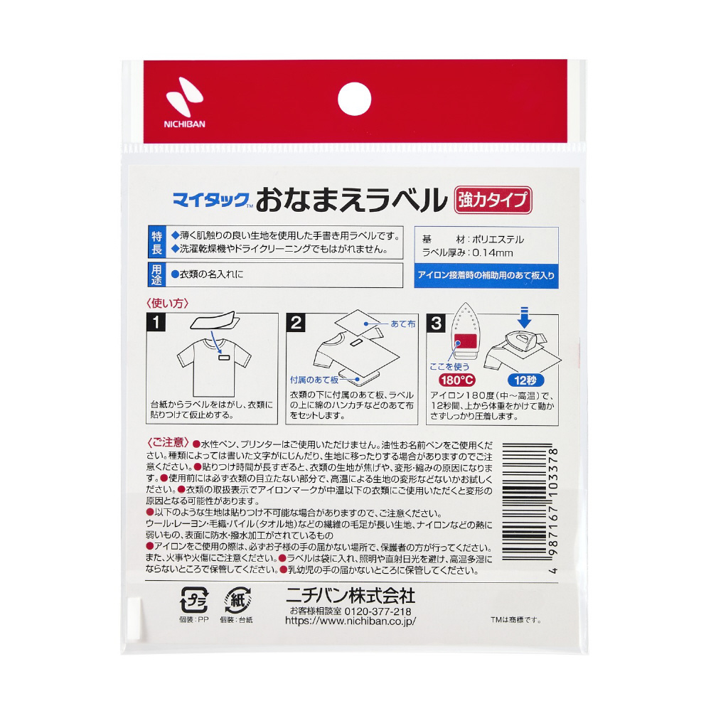 衣類などの布地にアイロンを使って接着することができるラベルです。接着後のラベルは約150回の洗濯・乾燥やドライクリーニングに耐えることができます。業務用の乾燥にも対応いたします。お子様の入園入学時や、介護施設に衣類を持ち込む時など衣類への名入れが必要な場合に便利です。