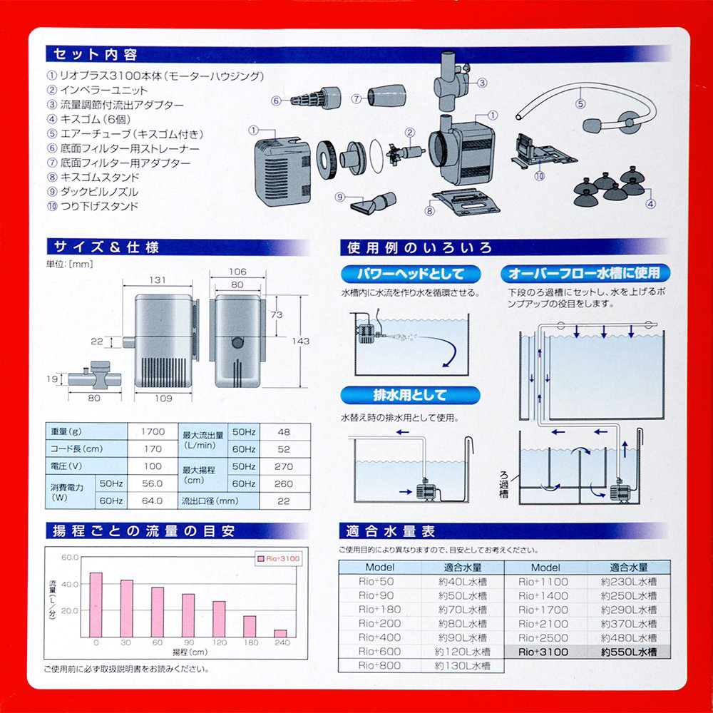 水中ポンプ本体1個、インペラーユニット1個、流量調節付流出アダブター1個、キスゴム4個、エアチューブ(キスゴム付き)1個、底面フィルター用ストレーナー1個、底面フィルター用アダブター1個、キスゴムスタンド1個、つり下げスタンド1個、タックピルノズル1個