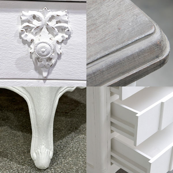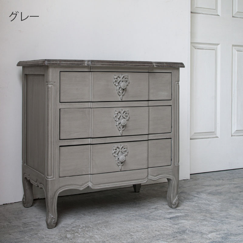 引出し3杯のフレンチチェスト、取手はおしゃれなデザイン取手に