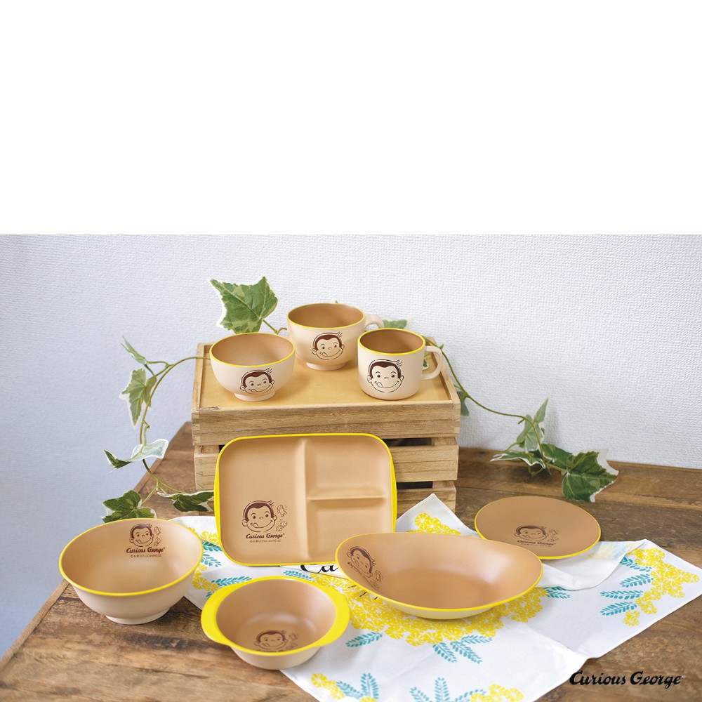 おさるのジョージの樹脂で出来た割れにくい食器。軽くて扱いやすく、安心して使える抗菌仕様です。