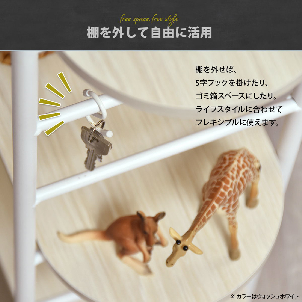 2枚の棚板は置くものに合わせて高さ調節可能。手軽に着脱出来るスナップロック方式を採用。外れにくくて安心です。