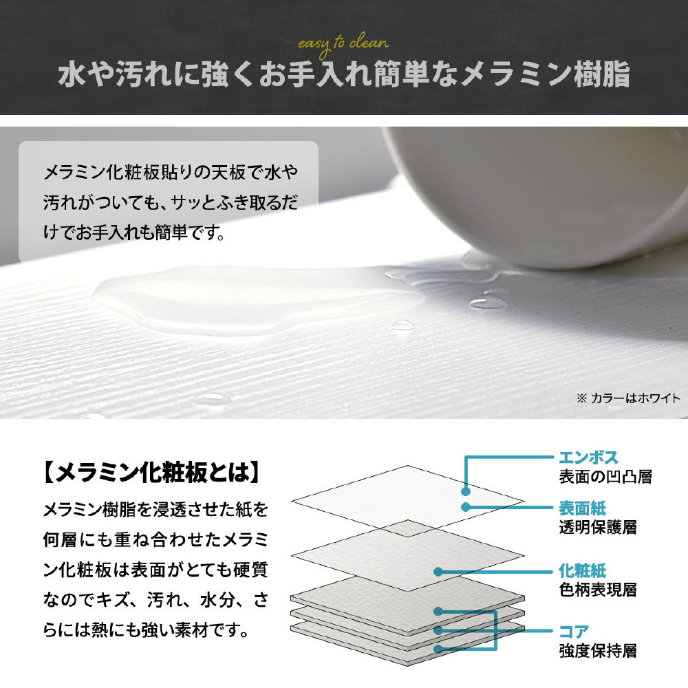 メラミン化粧板貼りの天板で、水や汚れがついてもさっと拭き取るだけでお手入れ簡単。