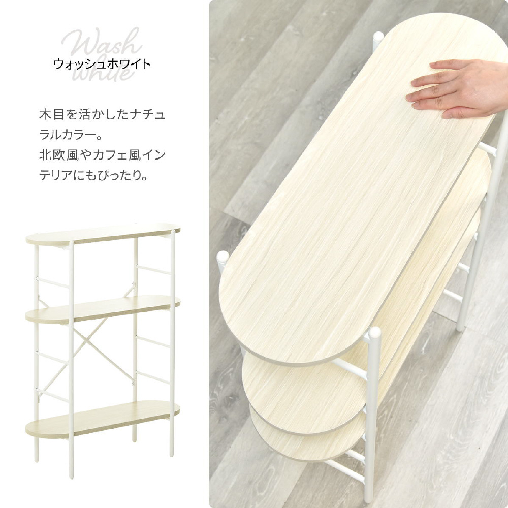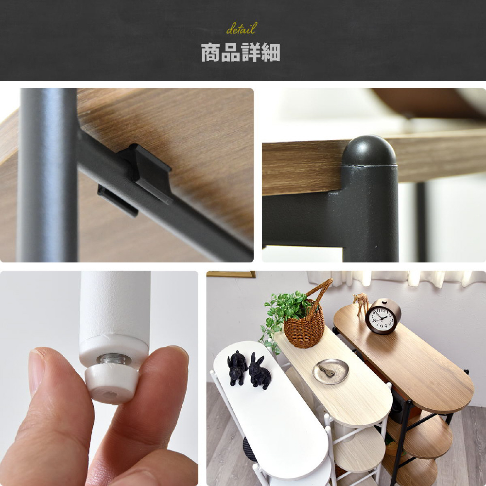 丸みのある天板と棚板が優しい印象を与えるコンソールテーブル。奥行23cmで、玄関や廊下にもすっきり置けます。棚板は工具不要でパチンと簡単に着脱でき、高さを自由に調節可能。飾り棚やちょっとした収納にも最適です。