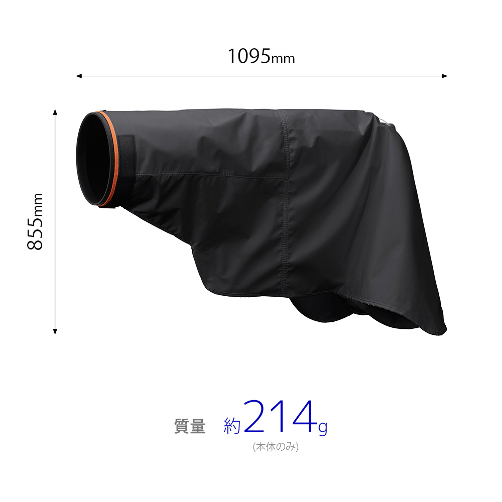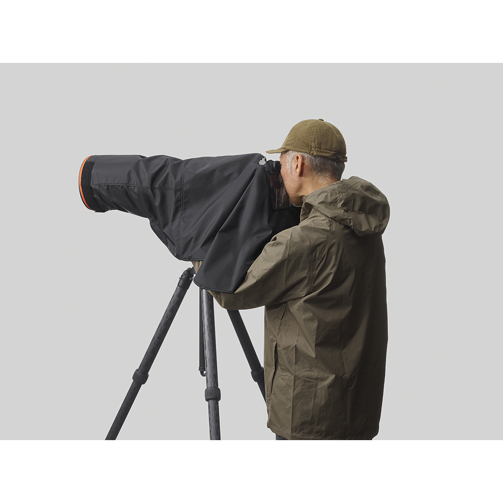 ・    面ファスナー機構により防滴、耐風性能を損なわず降雨・降雪時に容易にカメラおよびレンズに脱着でき、機材を保護しながらの撮影が可能