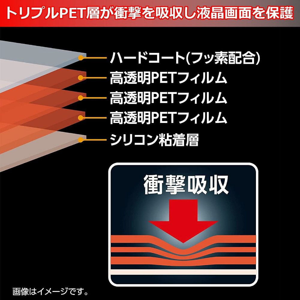 耐ショック・防水モデルに適した「耐衝撃」「撥水」液晶保護フィルム。トリプルPET層が衝撃や傷から液晶画面を守ります。