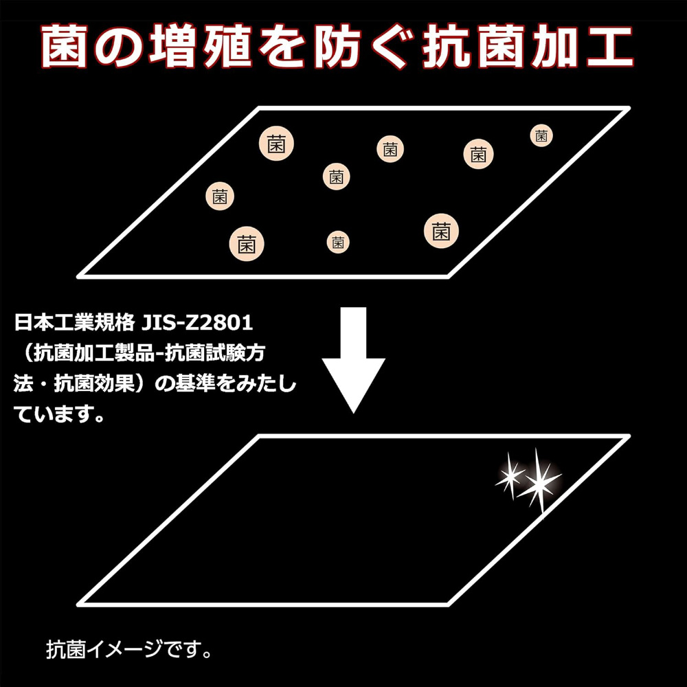 表面には撥水、指紋防止、抗菌、ハードコート加工、粘着面はバブルレスタイプを採用。