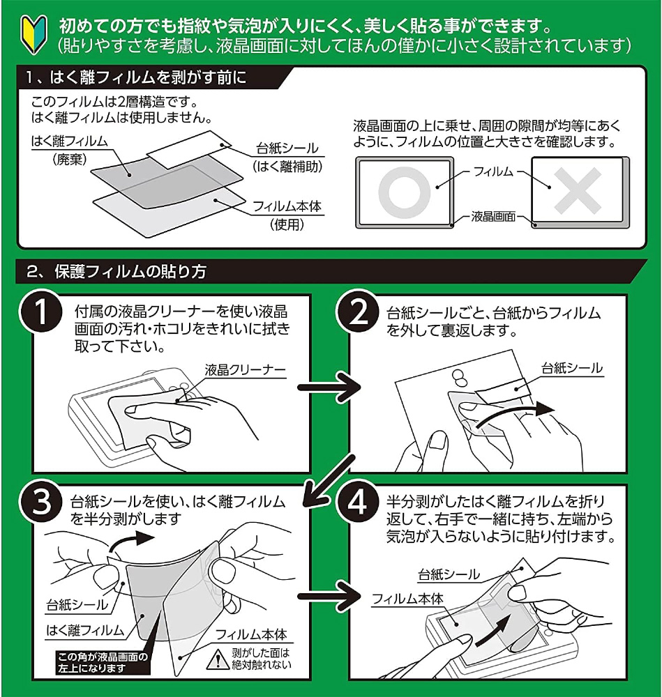 シリコン粘着層の自己吸着性により、フィルムを液晶画面に置くだけで自然に貼りつくため貼り付けが簡単です。