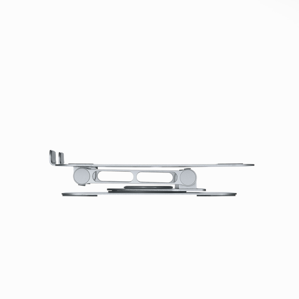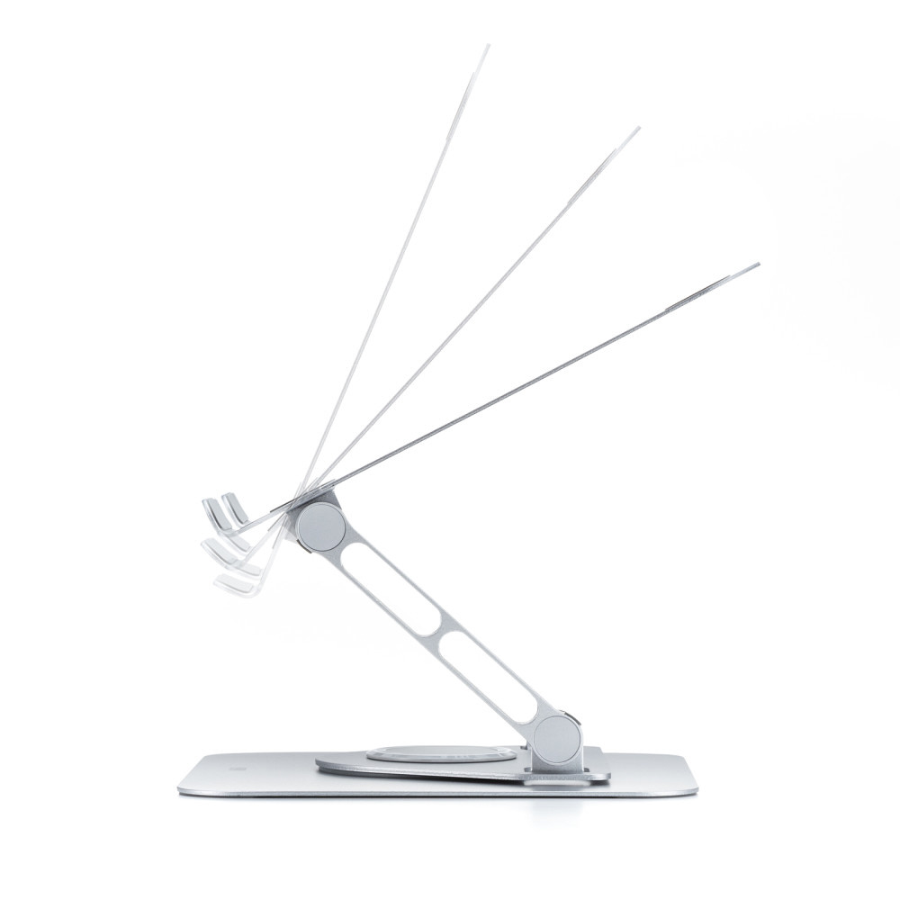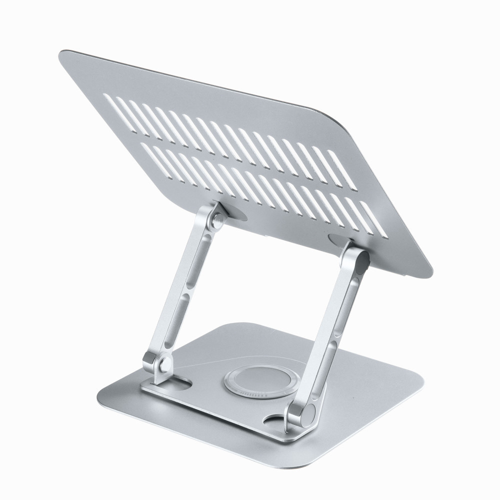 台座部分が360°回転できるノートパソコンスタンド。マグネットがくっつき、2つのヒンジで無段階で角度と高さが調整できる。