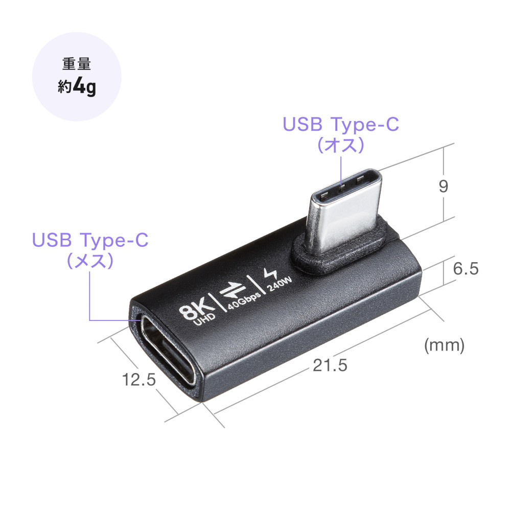 「Type-C変換アダプタ(CtoC・L字縦挿し・40Gbps・240W)」