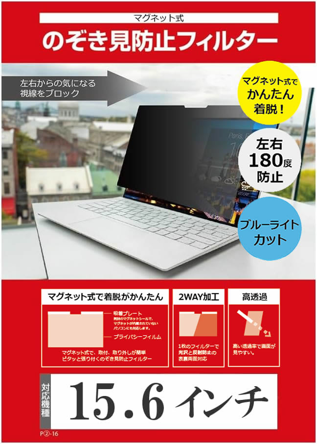 15.6インチ(16:9) マグネット式 のぞき見防止 プライバシー フィルター ブルーライトカット マグネットで取り外しできるタイプ 汎用