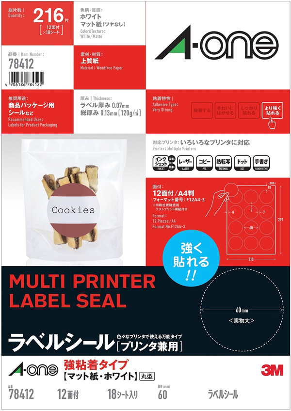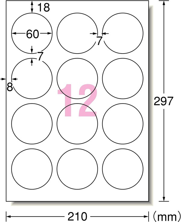 〔各種プリンタ〕ラベルシール 強粘着タイプ 丸型(60φx0.07mm) ホワイト 78412 [A4 /18シート /12面 /マット]
