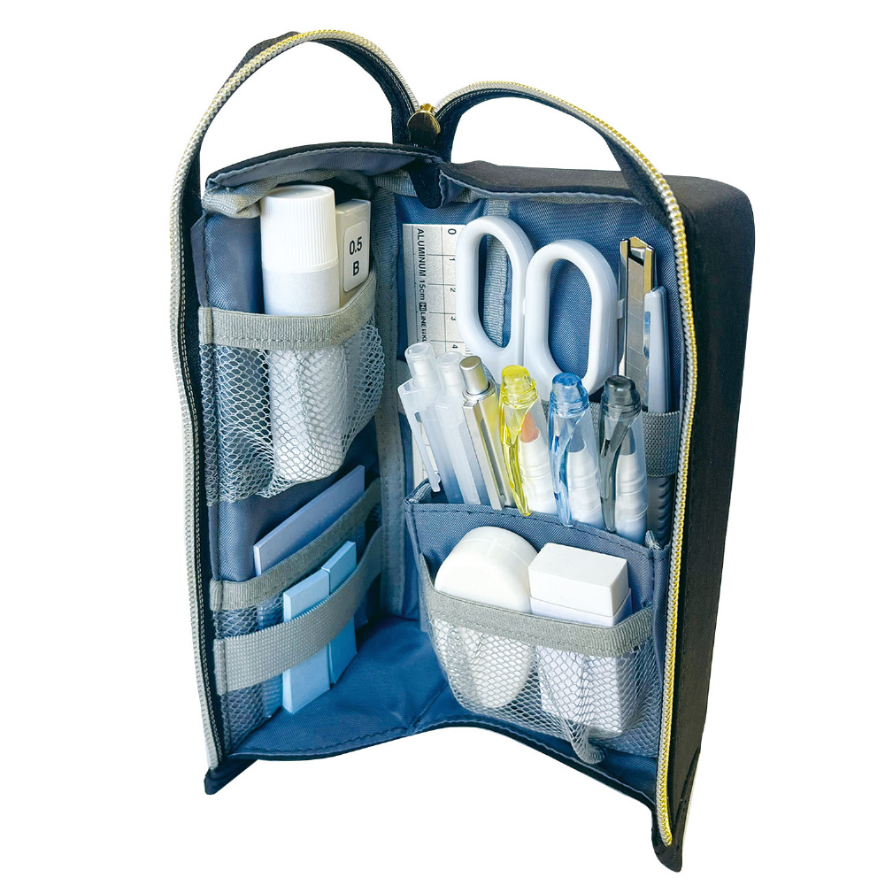 使いたいものがすぐ見つかる! L字にガバッとひらくスタンド型ペンケース 使いたいものがすぐ見つかる多機能な収納部 スタンド収納で筆記具が取り出しやすい 3つの小物ポケットと4つのゴムバンド付 フックにかけたり、持ちはこびしやすい形状 ※ペンケースの中身は収容イメージです。文房具は付属しておりません。