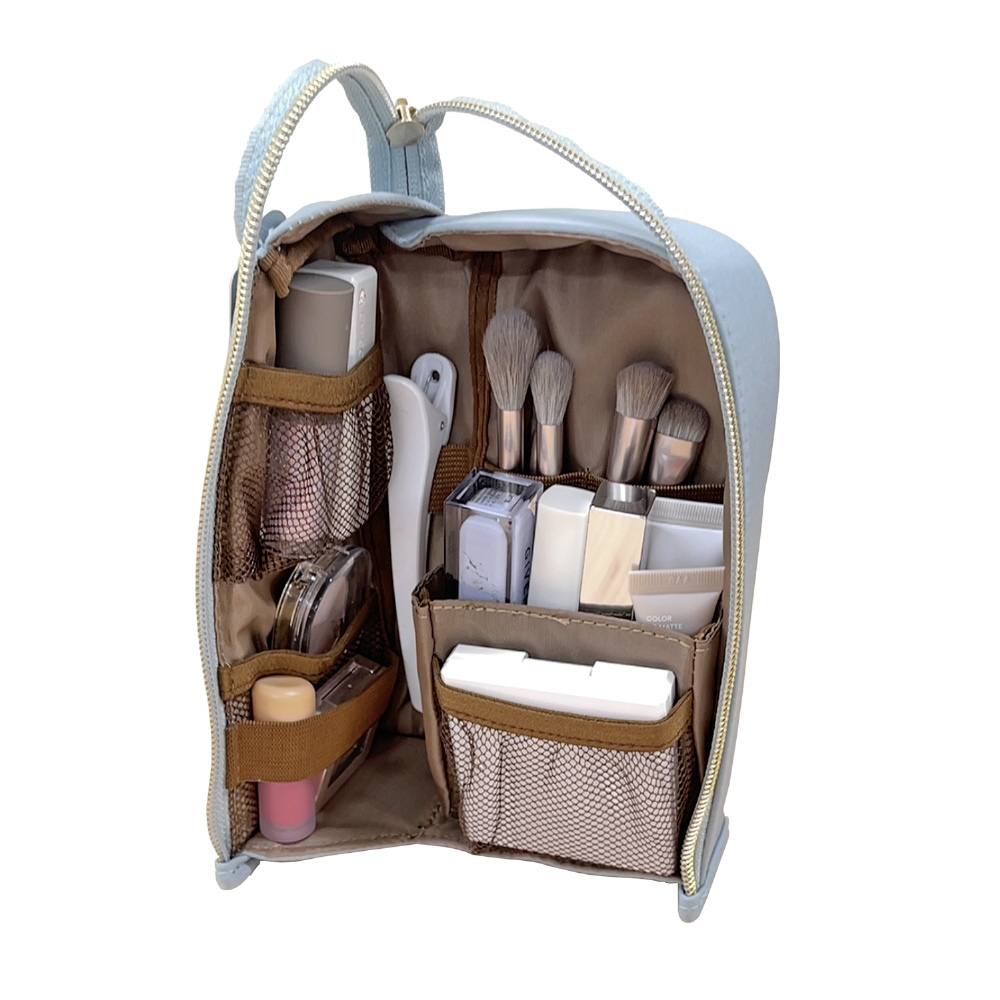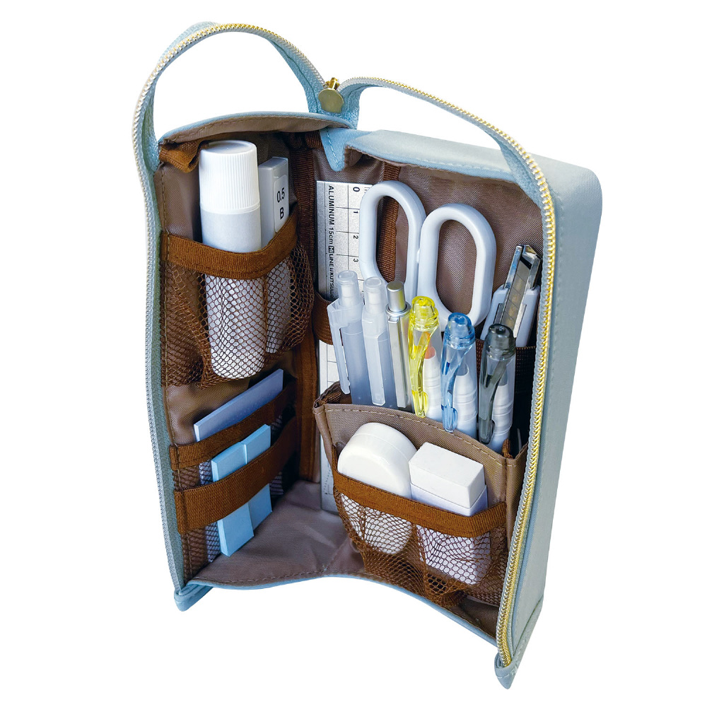 使いたいものがすぐ見つかる! L字にガバッとひらくスタンド型ペンケース 使いたいものがすぐ見つかる多機能な収納部 スタンド収納で筆記具が取り出しやすい 3つの小物ポケットと4つのゴムバンド付 フックにかけたり、持ちはこびしやすい形状 ※ペンケースの中身は収容イメージです。文房具は付属しておりません。