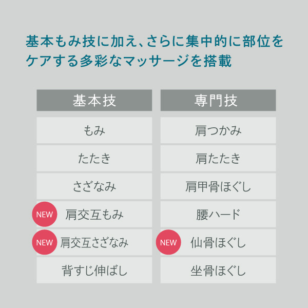 従来のもみ/たたき/さざなみ/背すじ伸ばしに加え、新たに「肩交互もみ」と