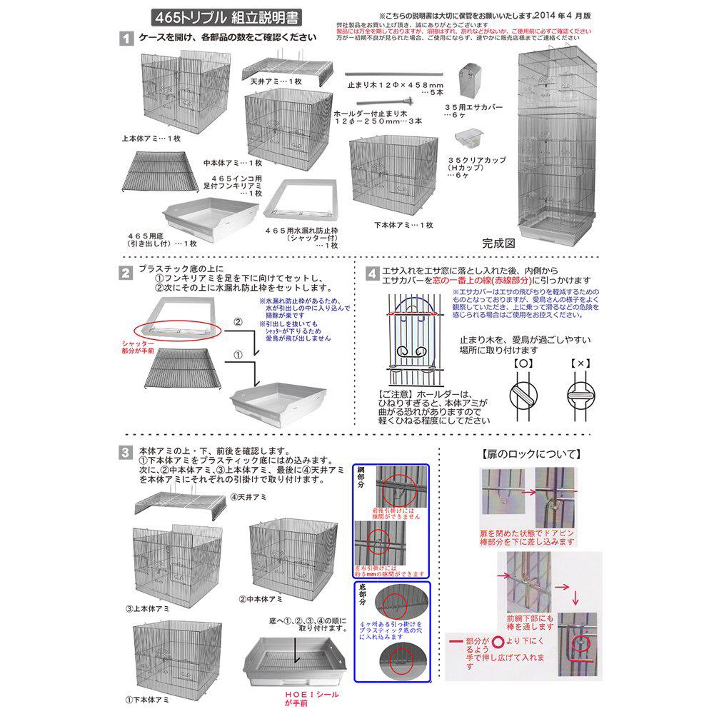 天井アミ×1枚、上本体アミ×1枚、中本体アミ×1枚、下本体アミ×1枚、465用底(引出し付)×1枚、465用水漏れ防止枠(シャッター付)×1枚、465用イン用足付フンキリアミ×1枚、465‐12パイ止まり木×5本、ホールダー付止まり木12パイ250mm×3本、35クリアカップ×6個、35用エサカバー×6個