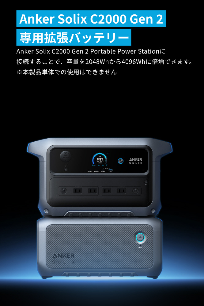 Anker Solix C2000 Gen 2 Portable Power Stationに接続することで、容量を2048Whから4096Whに倍増できます。※本製品単体での使用はできません