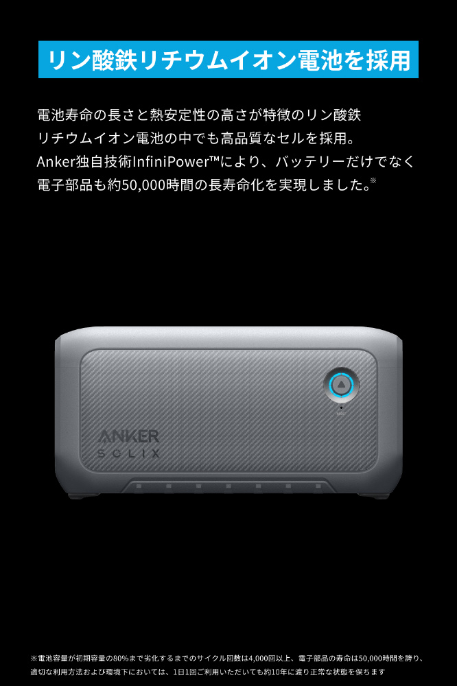 電池寿命の長さと安全性の高さが特徴のリン酸鉄リチウムイオン電池の採用に加え、前モデル「Anker 760拡張バッテリー」よりもサイクル回数が向上し4,000回以上になりました。独自技術InfiniPowerにより電子部品の長寿命化も実現。毎日使用しても10年間バッテリーの劣化を心配する必要がありません。