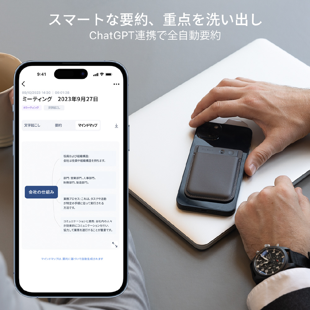 OpenAI Whisperを搭載したPLAUD NOTEの専用アプリは、録音された音声をタイムコード付きのテキストに正確に書き起こし、会話や内容を漏れなく正確に記録します。