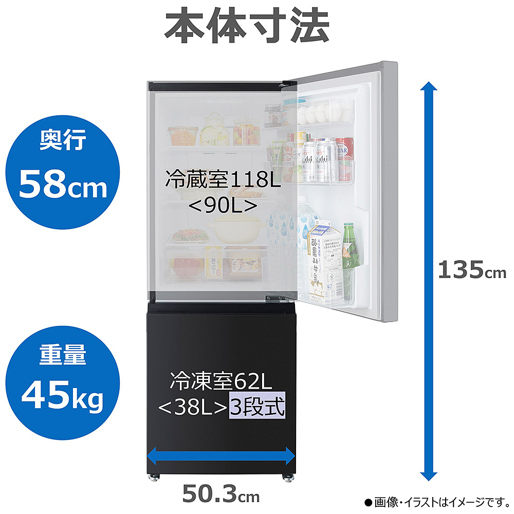 使いやすさにこだわり、シングルライフにぴったりな2ドアタイプ。2Lのペットボトルが3本も入るほか、冷蔵室のガラス棚も3段タイプ。コンパクトなのに使いやすい。