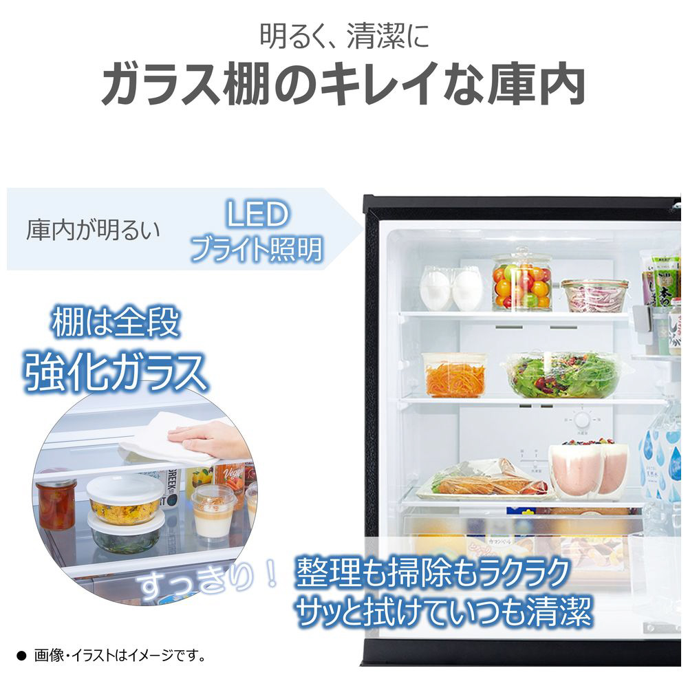 使いやすさにこだわり、シングルライフにぴったりな2ドアタイプ。2Lのペットボトルが3本も入るほか、冷蔵室のガラス棚も3段タイプ。コンパクトなのに使いやすい。