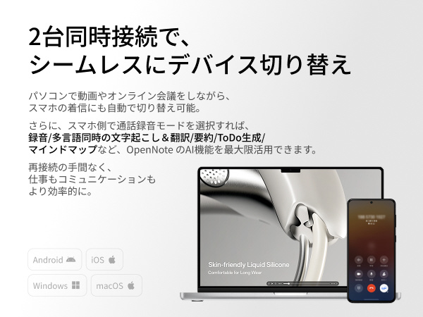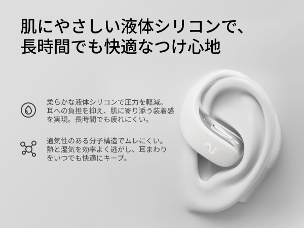 リキッドシリコンラバー製のイヤーフックは硬い素材に比べて耳の骨への圧力が少なく、無理のない快適な装着感を長時間維持します。