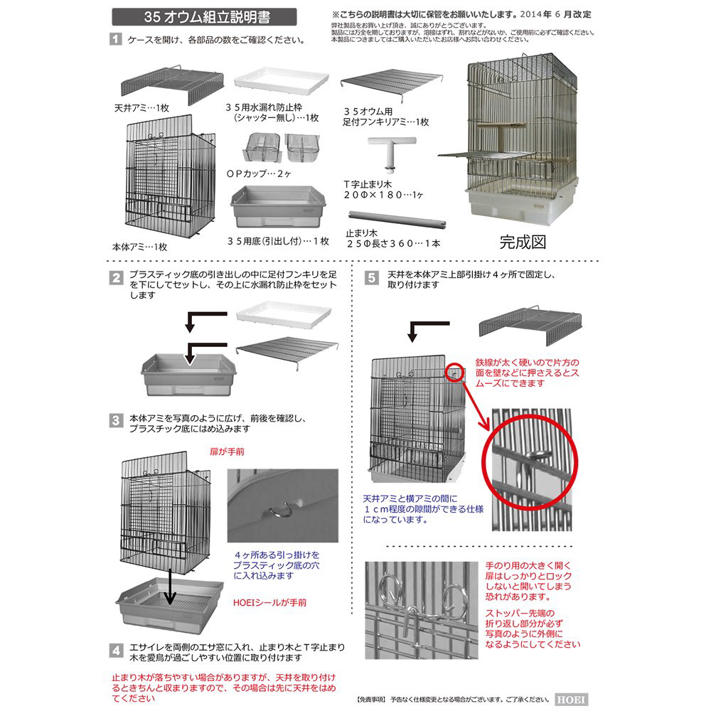 天井アミ×1枚、本体アミ×1枚、35用水漏れ防止枠(シャッター無し)×1枚、35オウム用足付フンキリアミ×1枚、35用底(引き出し付)×1枚、35‐25パイ止まり木×1本、T字止まり木20パイ×1ヶ、OPカップ×2ヶ
